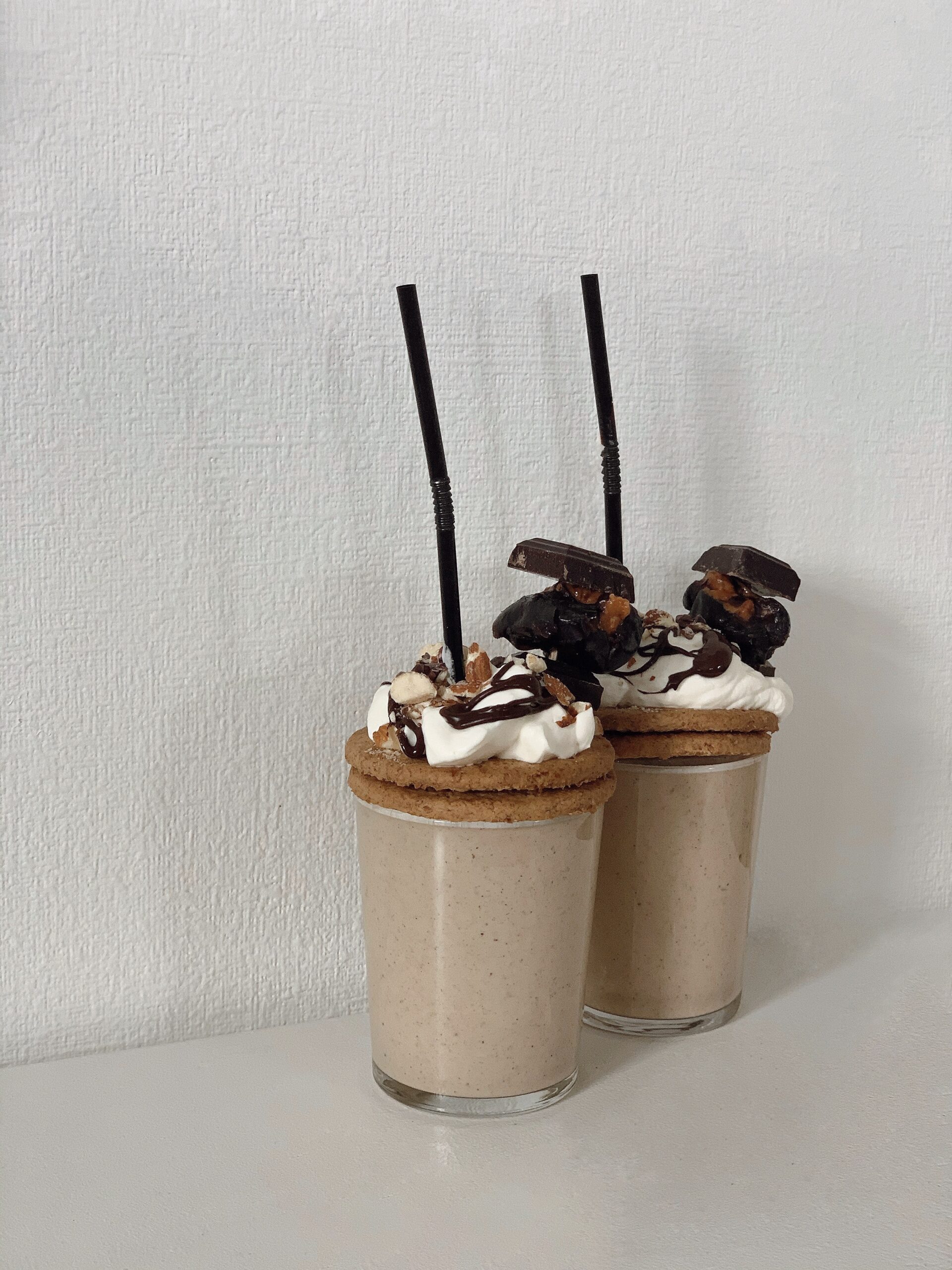 Mixa alla ingredienser och toppa sedan med valfri topping, jag hade digestive kex, grädde, smält mörk choklad, mörk choklad, hackade mandlar och dadlar fyllda med jordnötssmör. Det blev jävligt mastigt med all topping men själva smoothien är supergod och smakar verkligen salted caramel. Vill ni göra en liknande som jag gjorde med toppingen och allt så är ett stort tips för att äta/ dricka detta att hälla i allt i två skålar och äta med sked haha!
